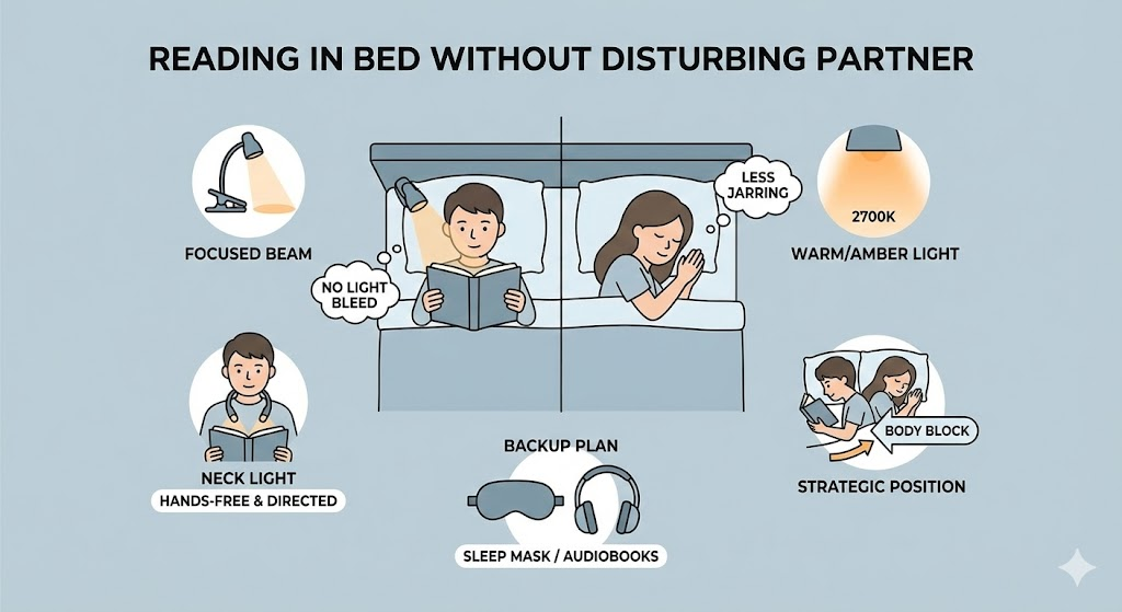 Use a book light with a focused, directional beam that only illuminates your pages. Neck reading lights work well because they point downward toward you, away from your partner. Choose warm or amber light (2700K or lower) which is less disruptive to sleep than cool white light. Position yourself so your body blocks the light from reaching your partner’s side of the bed.