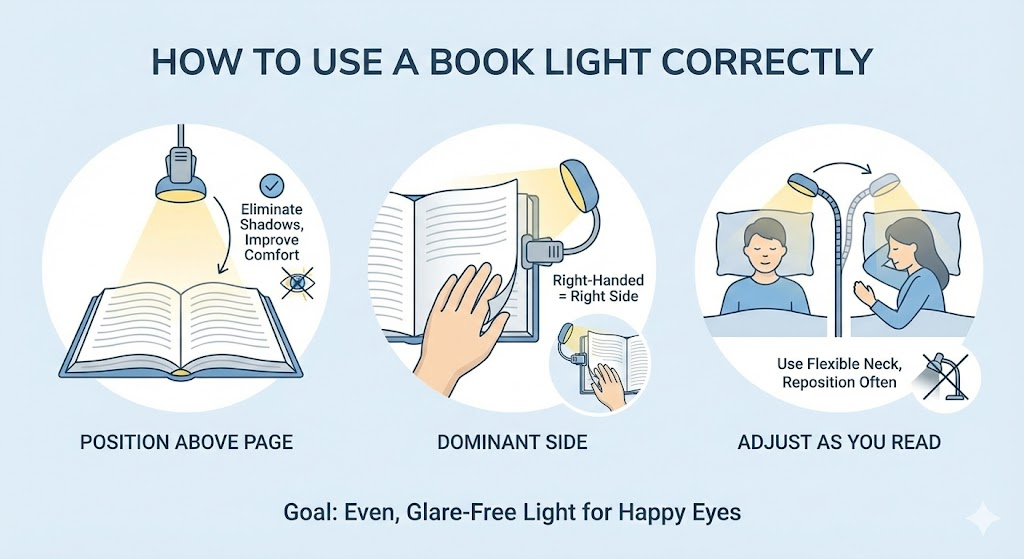 A book light seems simple enough. Clip it on, turn it on, read. But where you position it affects how comfortable your eyes feel after an hour of reading.